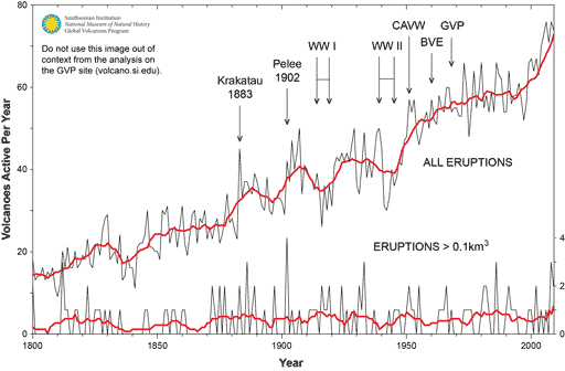 Therefore, generally, smaller eruptions might be decreasing with the appearance of ultra-massive eruptions (due to long-term warming effect).